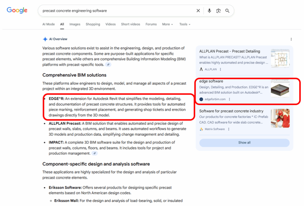 AI-powered SEO (AI SEO) results for a SAAS client with a brand-new website, ranking only behind Autodesk in search results.